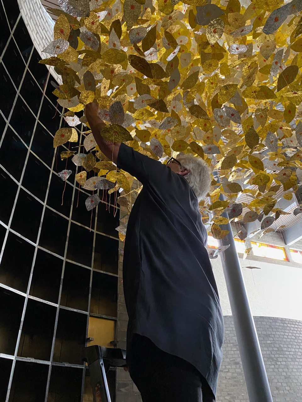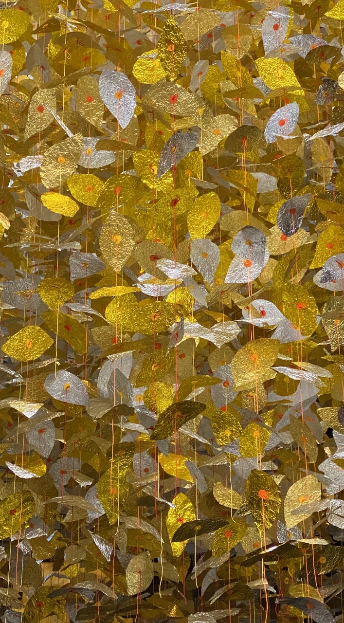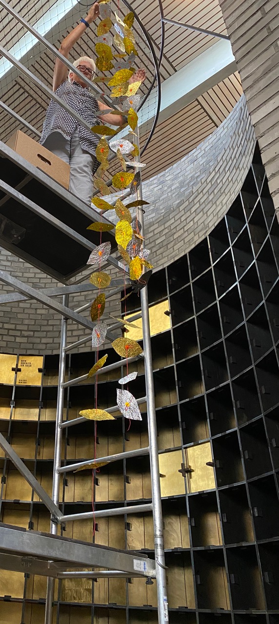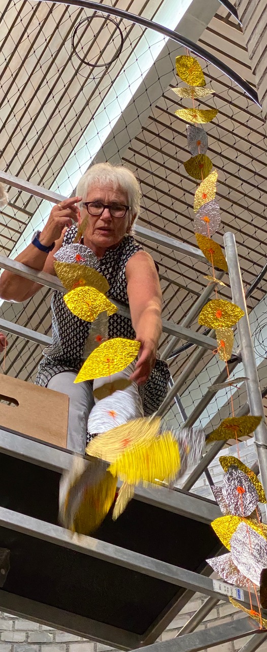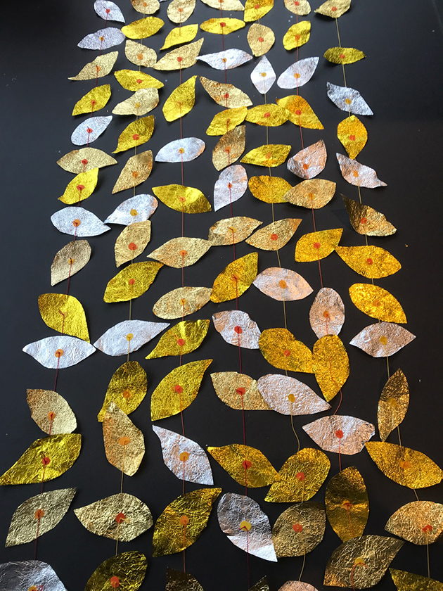 Die Blätter entstanden aus erst zerknitterten und dann wieder glattgestrichenen Aluminiumfolien. Sie sind mit einem Knoten voneinander getrennt. Auf jedem Knoten sitzt als Unterlegscheibe ein kleiner Kreis aus Papier. Er hält das Blatt in Position und gibt ihm Halt. Die Schnüre sind über drei Meter lang und weisen achtzehn bis fünfundzwanzig Blätter auf. Gegen 300 Schnüre hängen nun lose herunter und verändern die Installation stetig, sei es durch den Blickwinkel der Betrachtenden oder durch eine Luftbewegung. Sämtliche Blätter und Papierkreise hat die Künstlerin manuell geschnitten, aufgefädelt und vor Ort in luftiger Höhe Stück für Stück an einen Reifen geknüpft. Ein meditativer, rhythmisierter und repetitiver Herstellungsprozess, der sich auf das Werk übertragen hat.