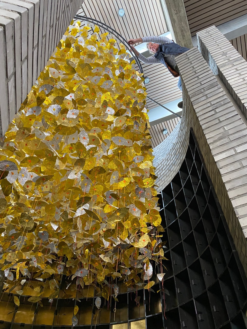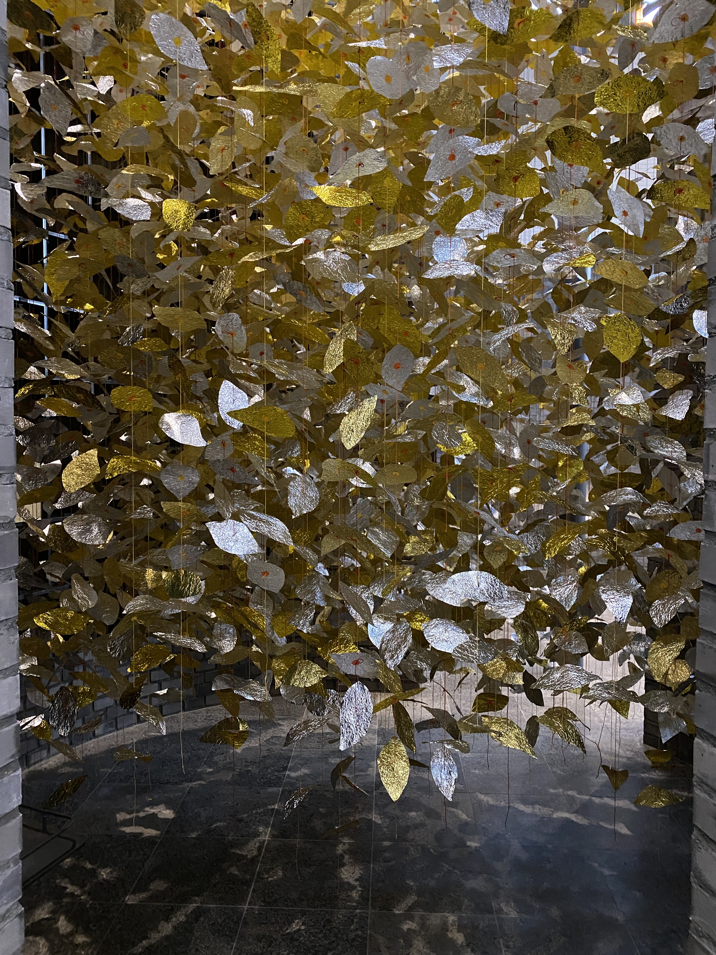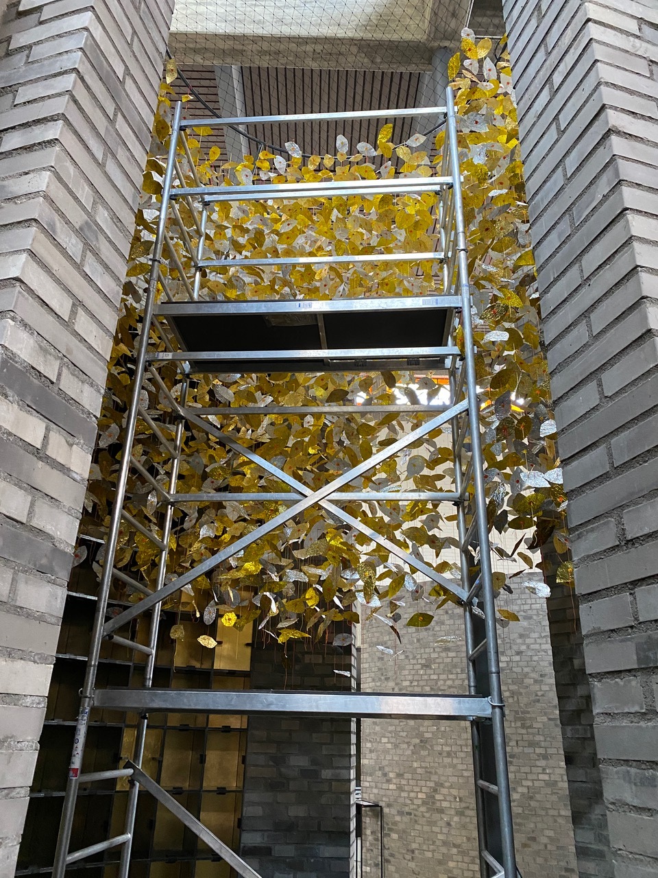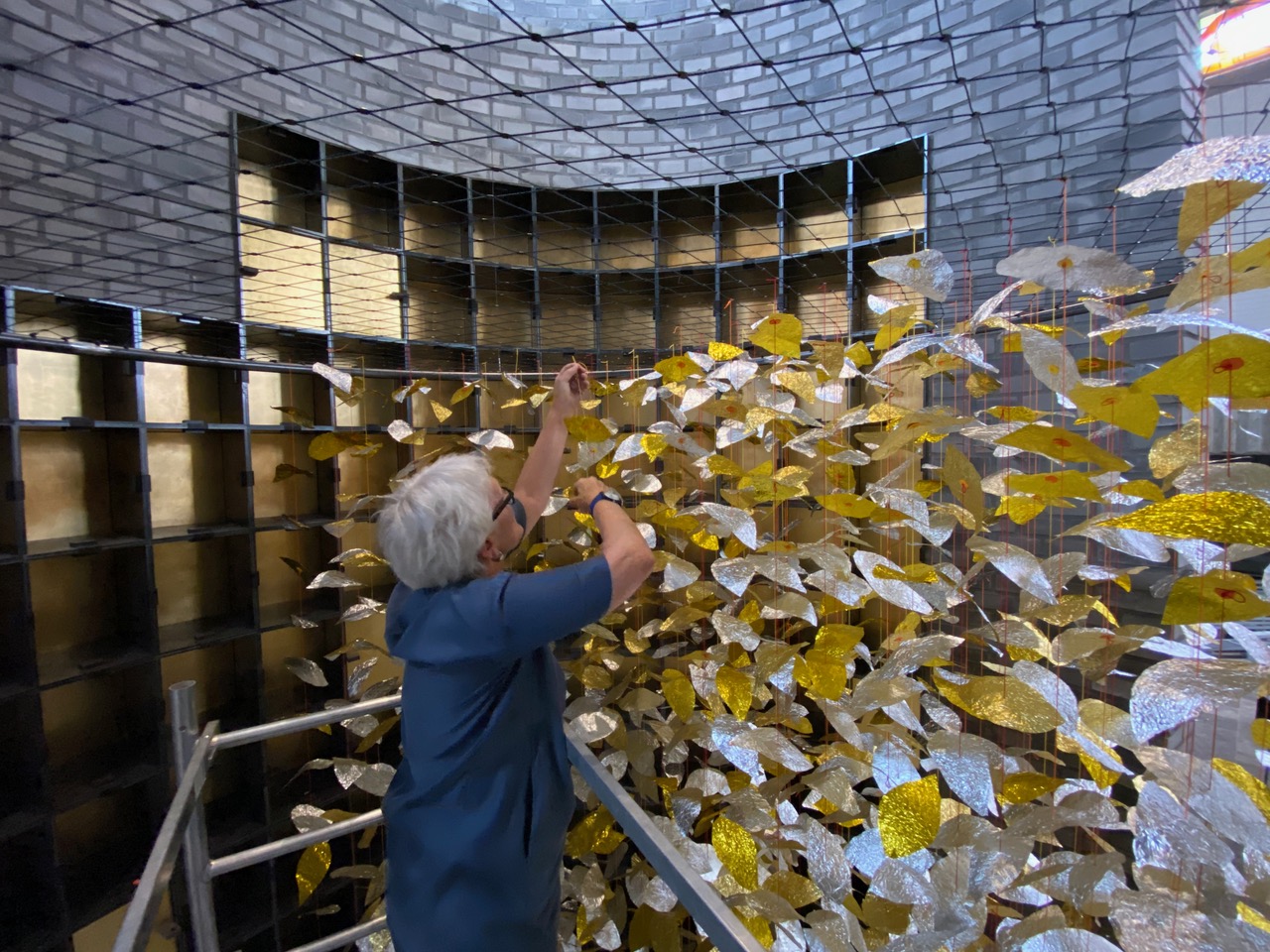 Die Blätter entstanden aus erst zerknitterten und dann wieder glattgestrichenen Aluminiumfolien. Sie sind mit einem Knoten voneinander getrennt. Auf jedem Knoten sitzt als Unterlegscheibe ein kleiner Kreis aus Papier. Er hält das Blatt in Position und gibt ihm Halt. Die Schnüre sind über drei Meter lang und weisen achtzehn bis fünfundzwanzig Blätter auf. Gegen 300 Schnüre hängen nun lose herunter und verändern die Installation stetig, sei es durch den Blickwinkel der Betrachtenden oder durch eine Luftbewegung. Sämtliche Blätter und Papierkreise hat die Künstlerin manuell geschnitten, aufgefädelt und vor Ort in luftiger Höhe Stück für Stück an einen Reifen geknüpft. Ein meditativer, rhythmisierter und repetitiver Herstellungsprozess, der sich auf das Werk übertragen hat.