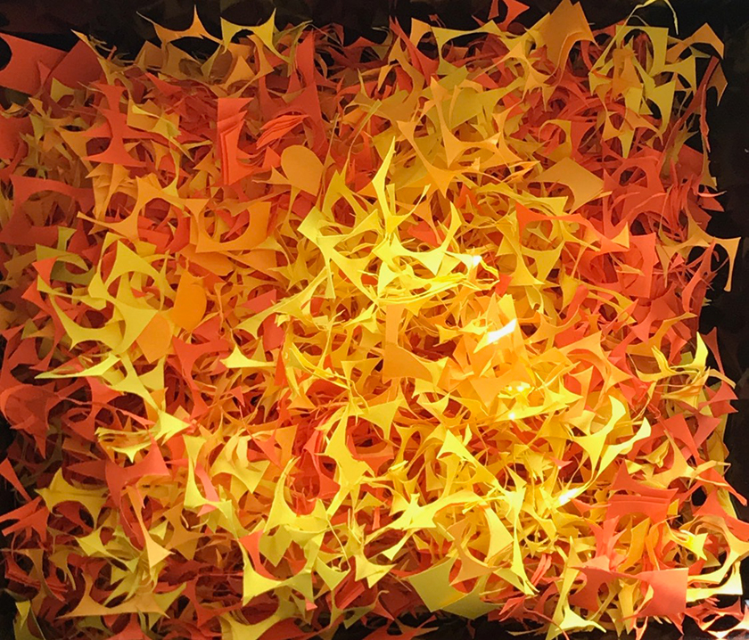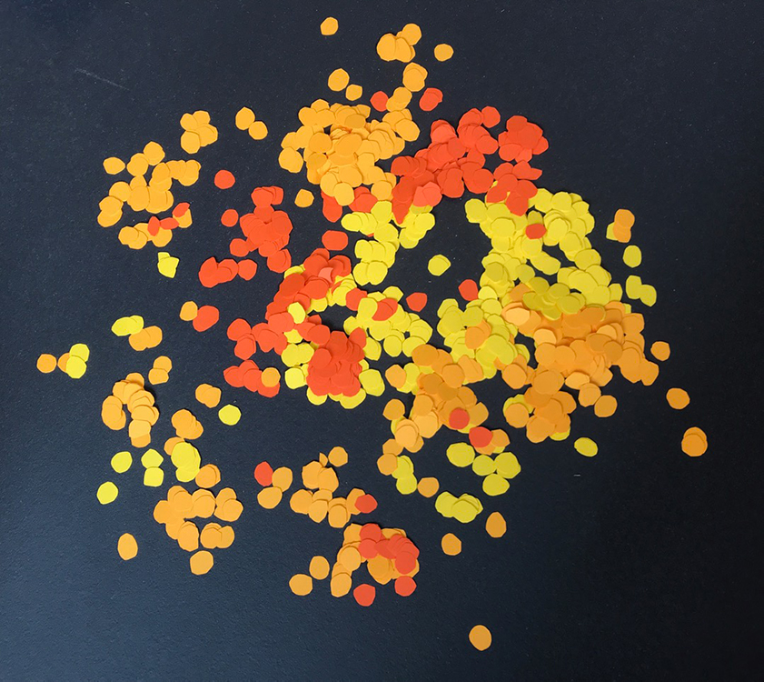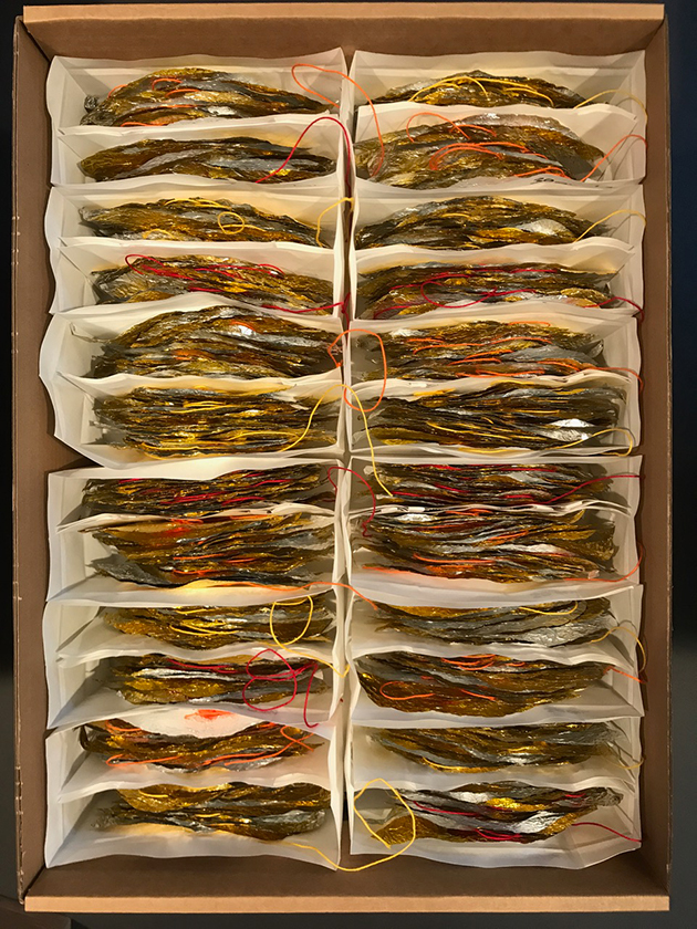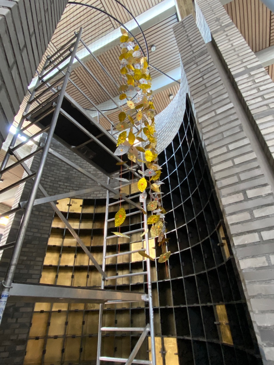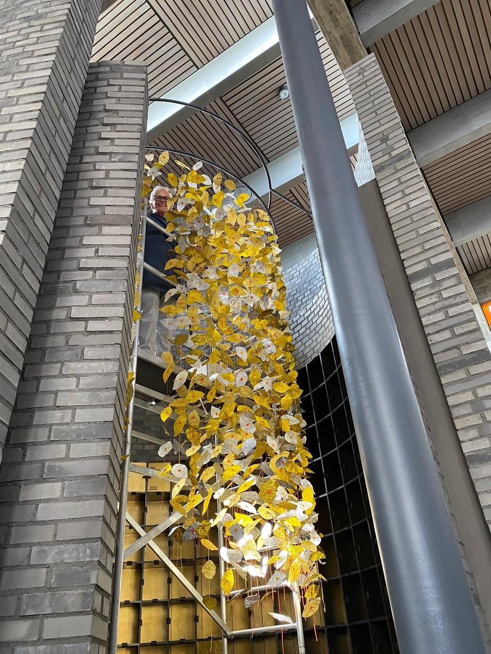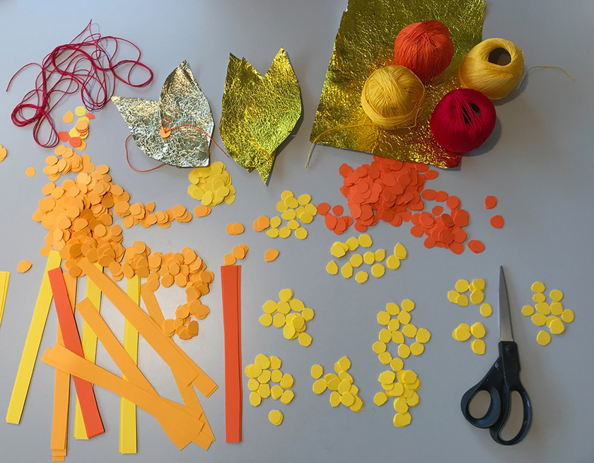 Die Blätter entstanden aus erst zerknitterten und dann wieder glattgestrichenen Aluminiumfolien. Sie sind mit einem Knoten voneinander getrennt. Auf jedem Knoten sitzt als Unterlegscheibe ein kleiner Kreis aus Papier. Er hält das Blatt in Position und gibt ihm Halt. Die Schnüre sind über drei Meter lang und weisen achtzehn bis fünfundzwanzig Blätter auf. Gegen 300 Schnüre hängen nun lose herunter und verändern die Installation stetig, sei es durch den Blickwinkel der Betrachtenden oder durch eine Luftbewegung. Sämtliche Blätter und Papierkreise hat die Künstlerin manuell geschnitten, aufgefädelt und vor Ort in luftiger Höhe Stück für Stück an einen Reifen geknüpft. Ein meditativer, rhythmisierter und repetitiver Herstellungsprozess, der sich auf das Werk übertragen hat.
