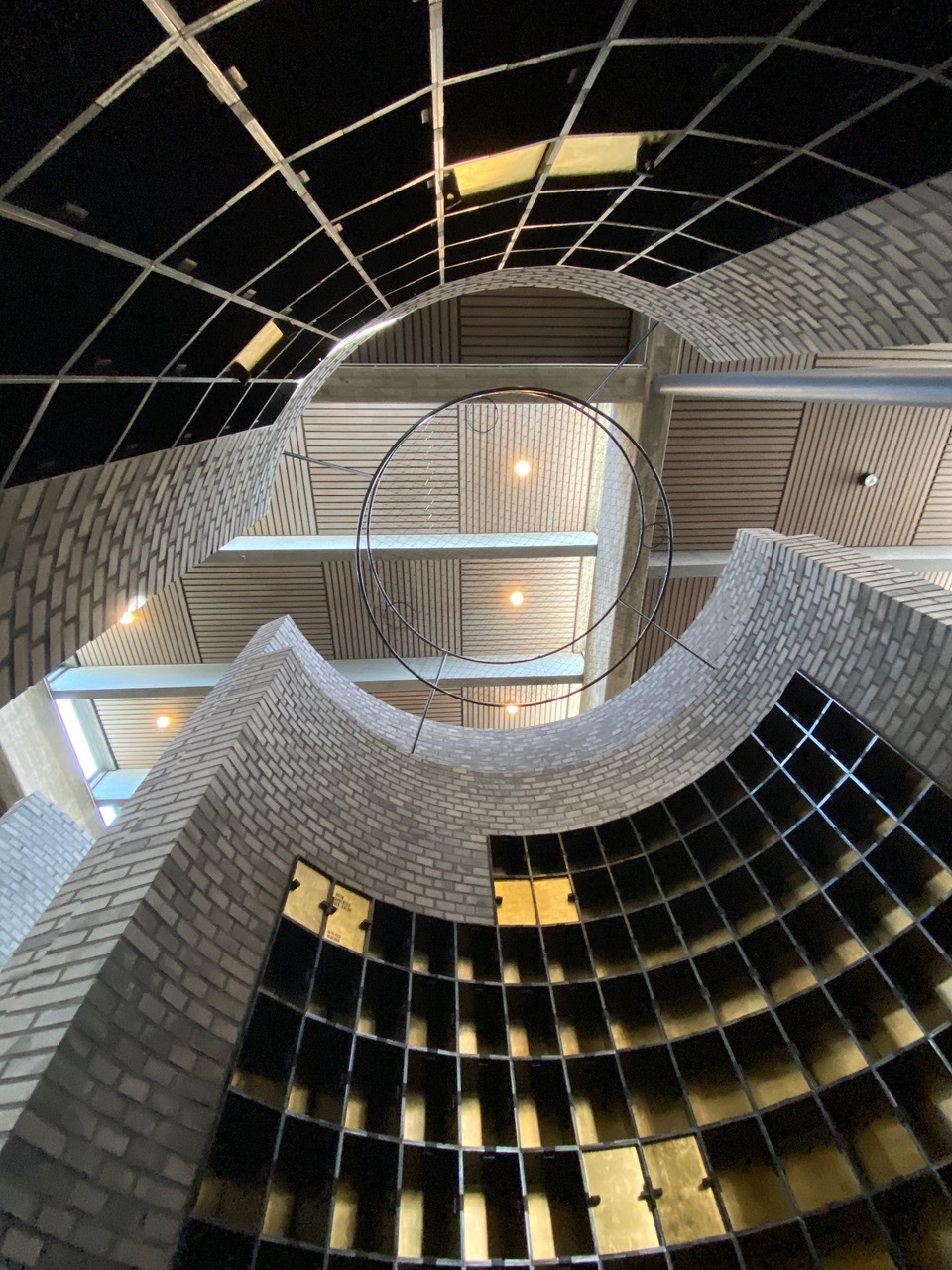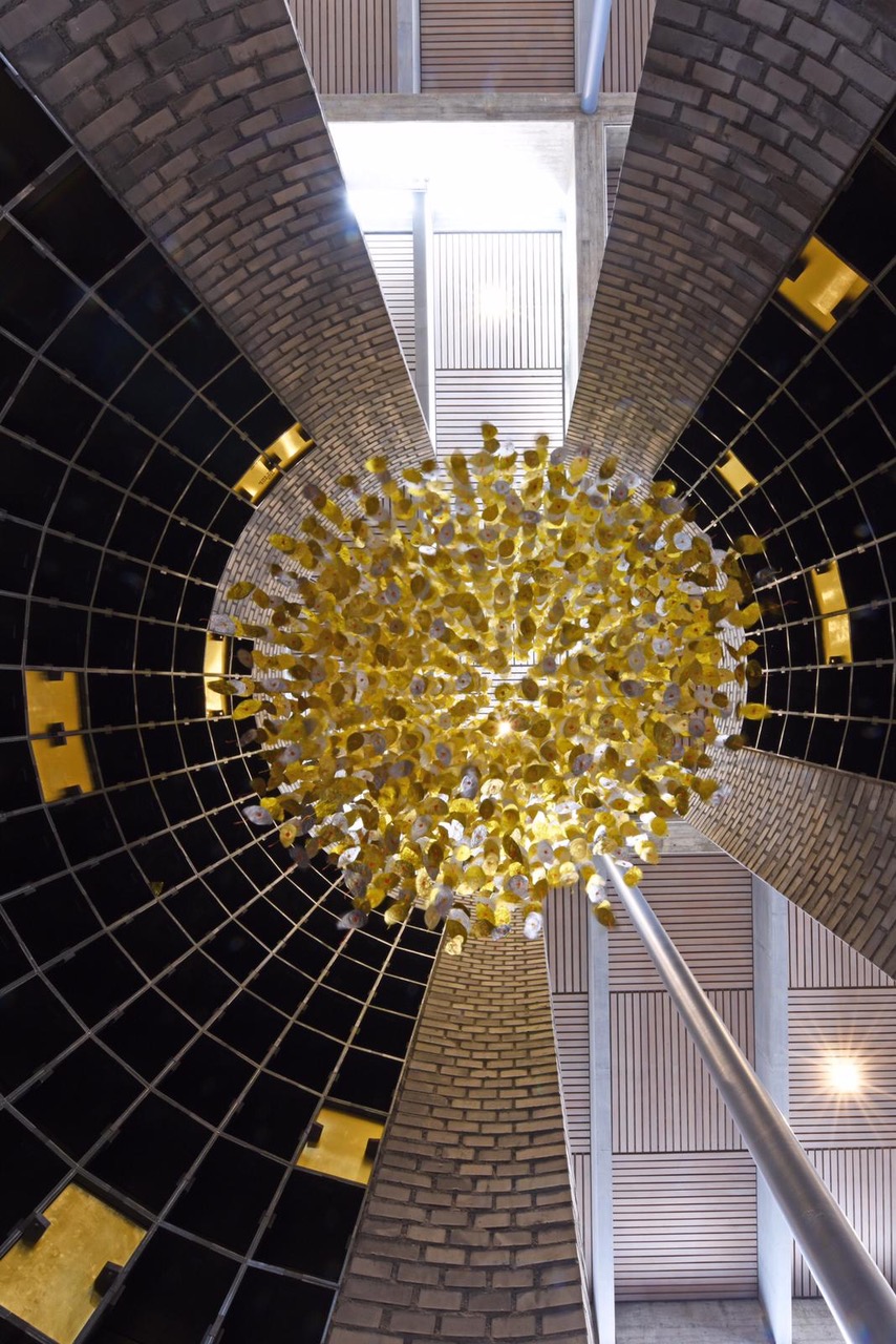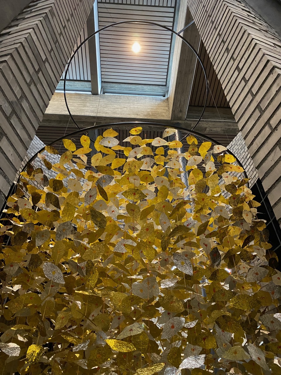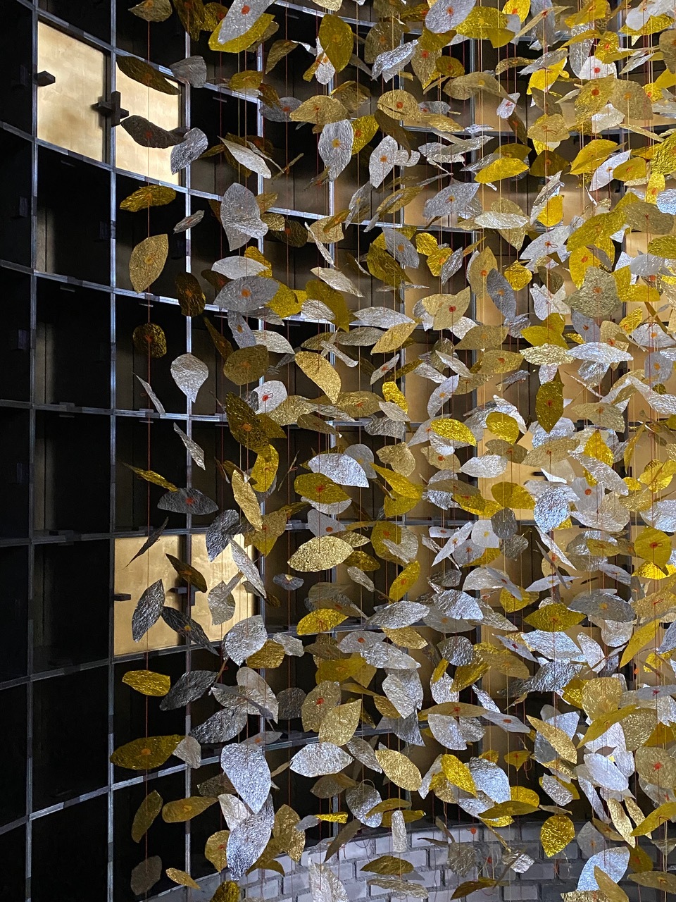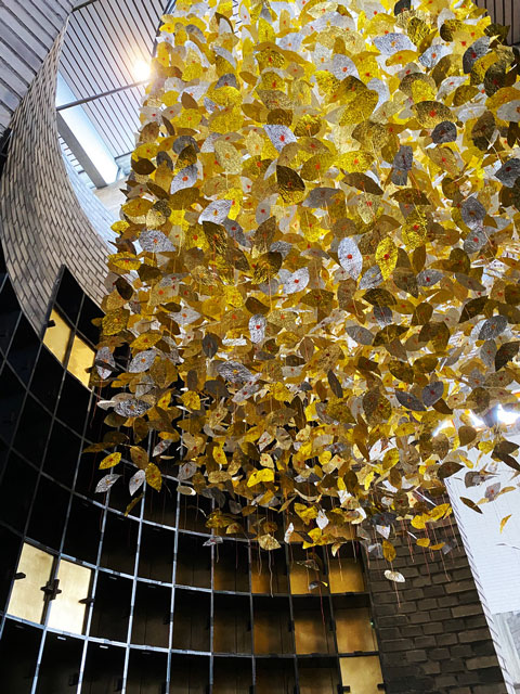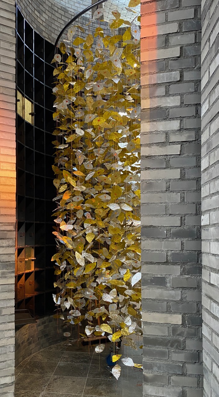 Von hoch oben fallen tausende von silbernen und goldenen Blättern an roten, orangen und gelben Schnüren in den Rundbau mit den Urnenkammern. Sie schweben im Zentrum des sakralen Raumes mit den zwei Öffnungen, die Eingang und Ausgang zugleich sind. Die Blätter versetzen sich bereits durch Gehen in feine Bewegung und lassen innehalten.