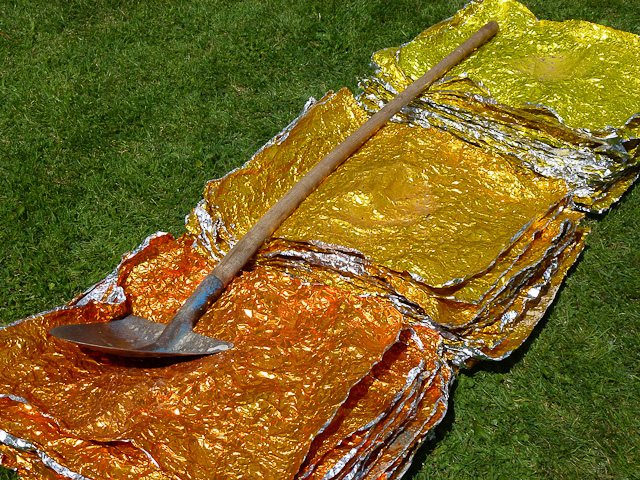 Im Juli 2010 hat GertrudAnna Wyden in der Mitte der Räucherkammer grossformatige Aluminiumfolien in verschiedenen Goldtönen Schicht für Schicht behutsam aufeinandergelegt.