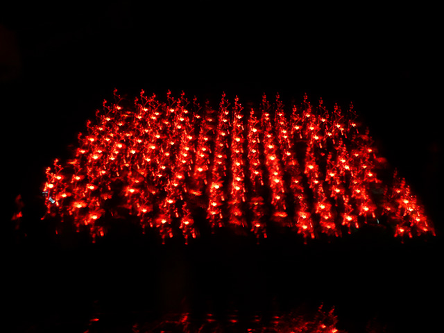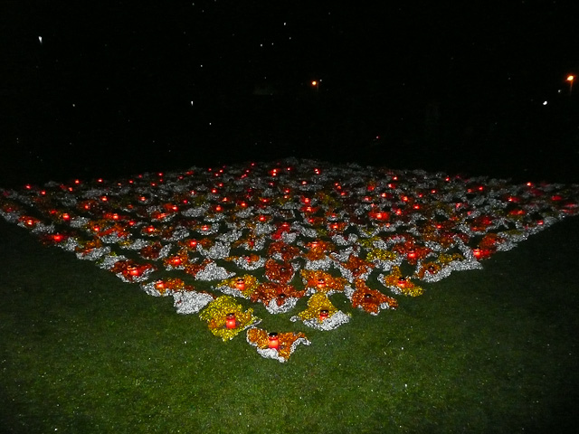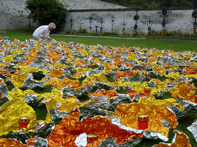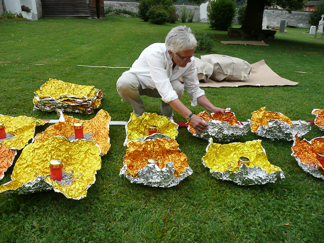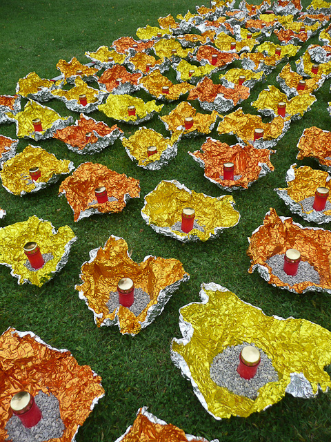 Die Künstlerin hat jede Folie mit einer Kerze versehen und bei Einbruch der Nacht Kerze um Kerze angezündet. Die vierhundert Lichter begleiten durch die Nacht und in den neuen Tag.