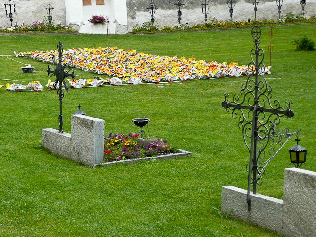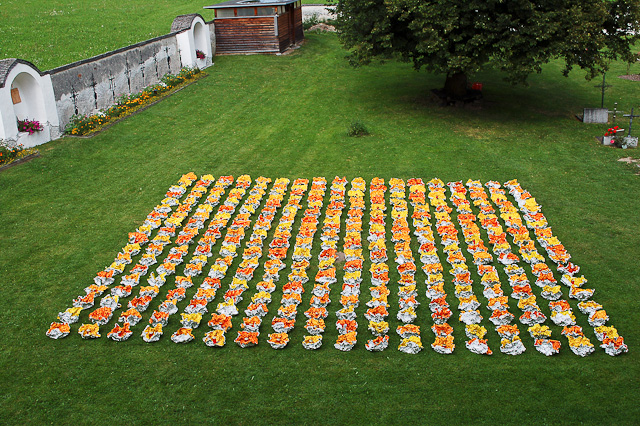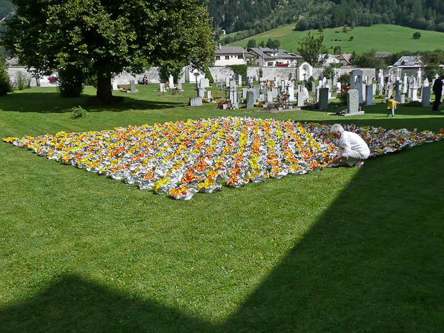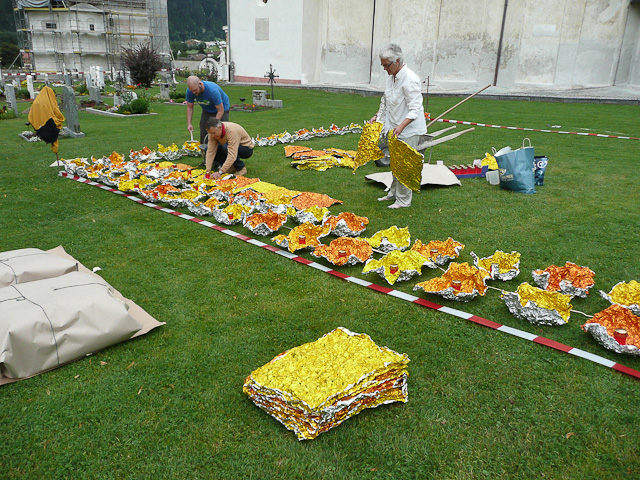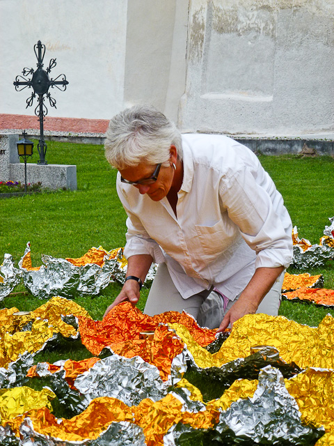 In der Klosternacht vom 5. August 2011 hat die Künstlerin ihr Werk Schicht um Schicht abgetragen und jede Folie einzeln auf der Friedhofswiese ausgelegt. Vierhundert Schichten sind es, die sie zu einem Quadrat fügte. Dies benötigt Zeit, Zeit, welche die Künstlerin sich bewusst nimmt.