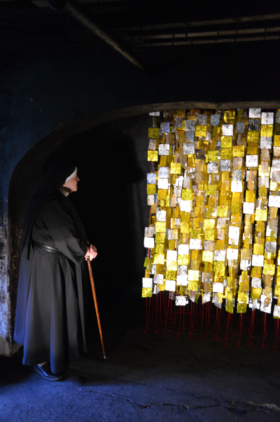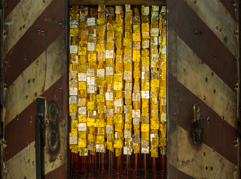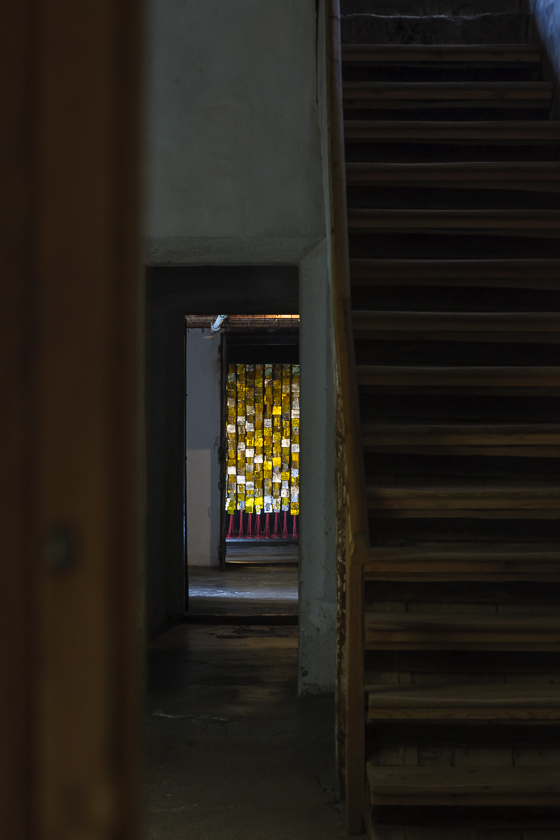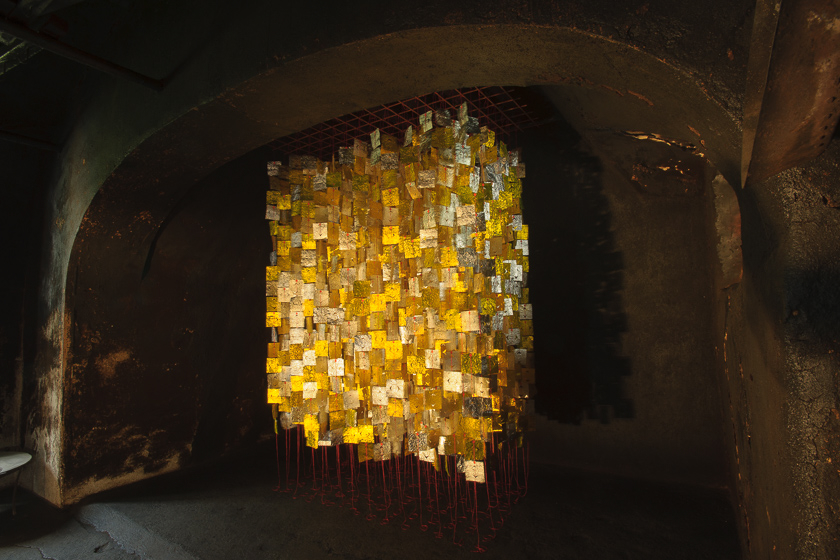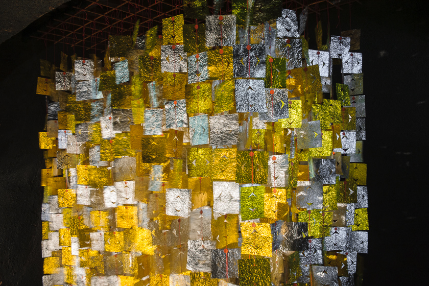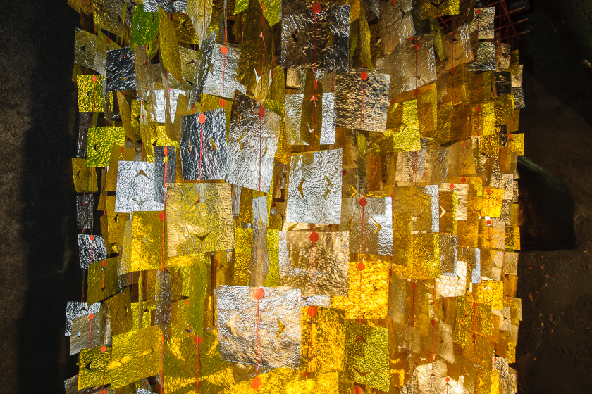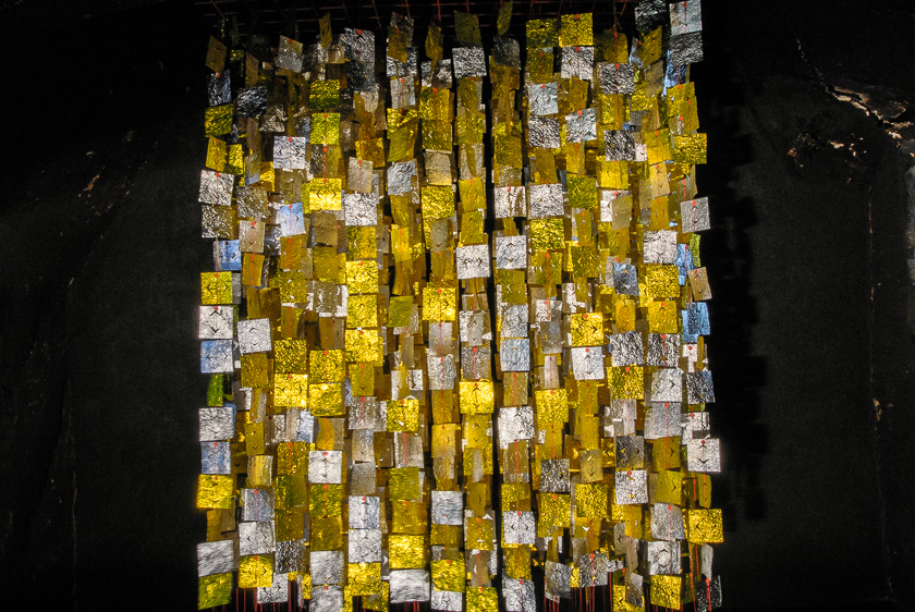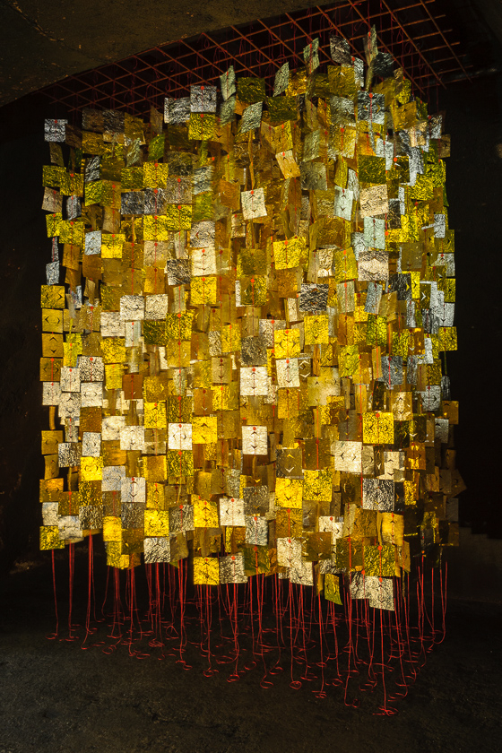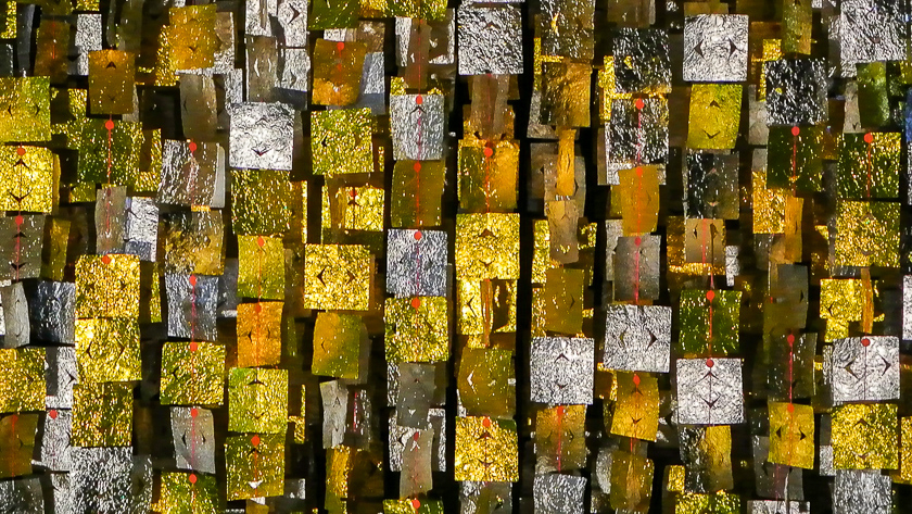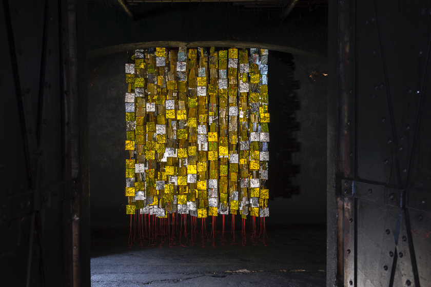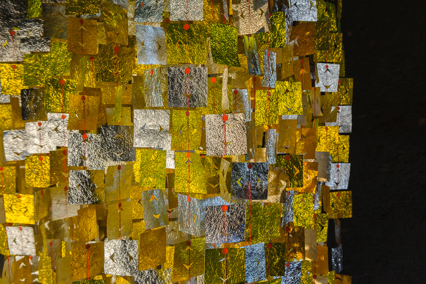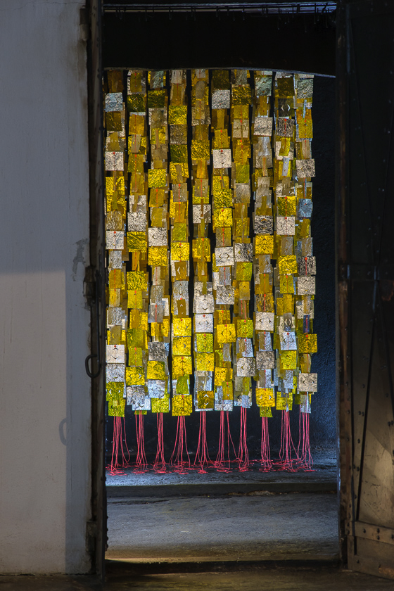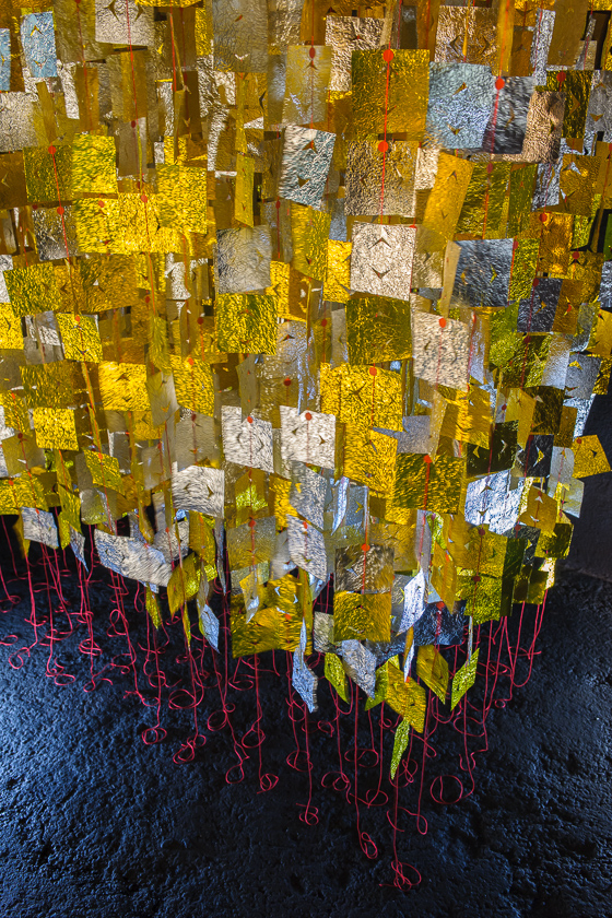 Und wo vor fünf Jahren horizontal geschichtete, grossformatige Aluminiumfolien aus der rabenschwarzen Räucherkammer schimmerten und von Verwandlung erzählten, hängen nun an roten Fäden und mit roten Punkten verbundene, kleinformatige Quadrate aus silbernen und goldenen Folienblättern mit je zwei ausgeschnittenen Dreiecken von der Decke und machen Verbindungen und Ordnungen sichtbar. Sie verbinden unten mit oben, Erde mit Himmel, links mit rechts. Die lichte und leichte Installation erfindet sich mit jedem Lufthauch neu.